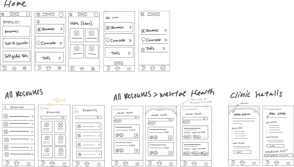 I sketched out a few ideas for home and some important screens. Some ideas include a filter feature for all users to narrow search results (Occupation type, service type, hours, etc) and pop-up screens for easy navigation.