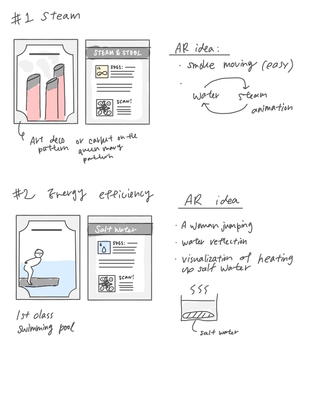 I designed the back of three informational postcards, each showcasing specific parts or locations of the ship. Augmented Reality (AR) elements complement the information on the back, making it engaging.
