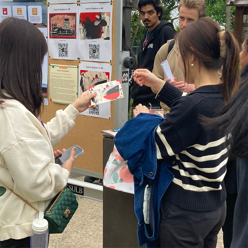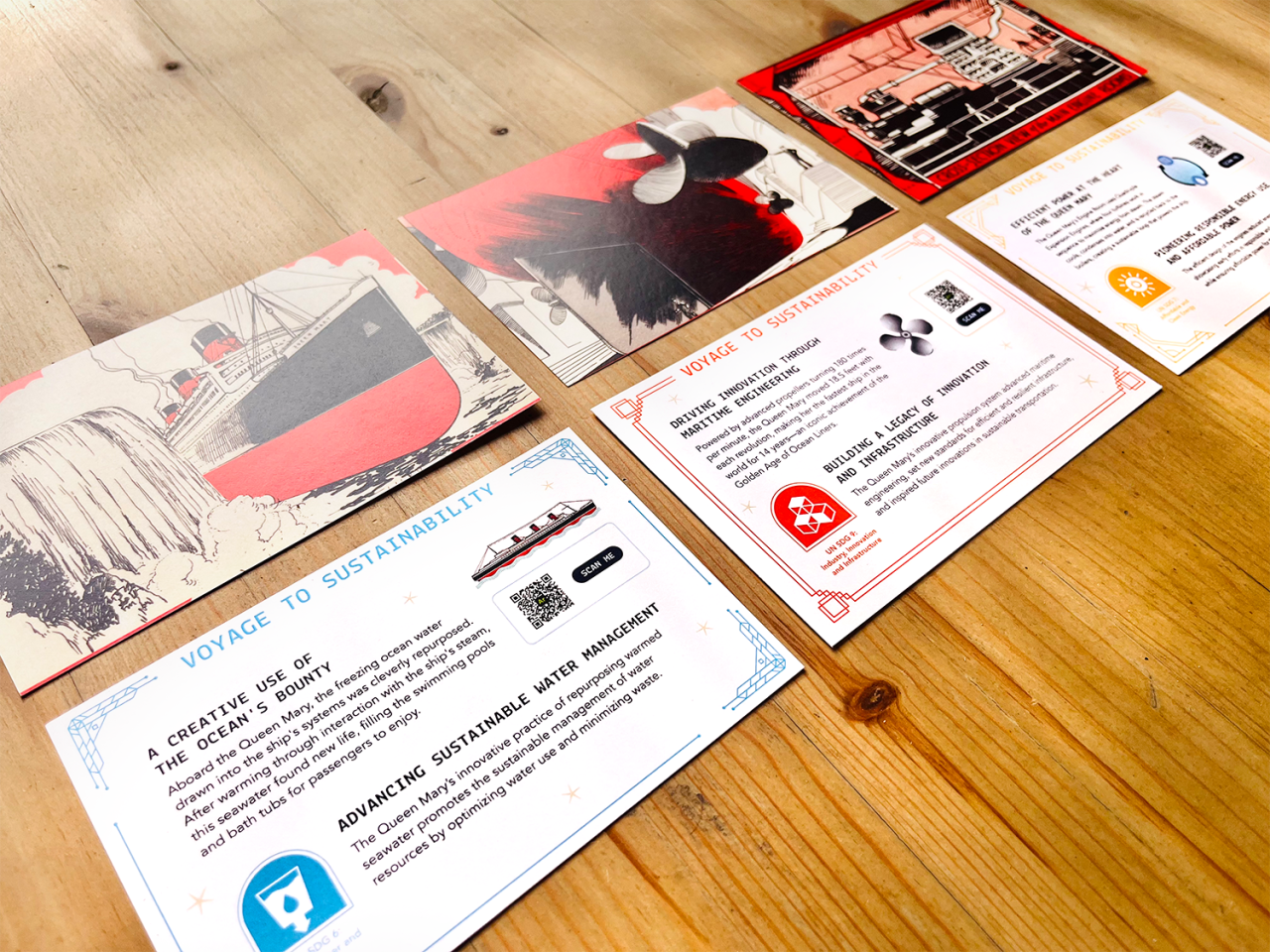 The back of each card includes details about the ship’s sustainability efforts and history, along with a QR code for Adobe Aero. When scanned, the code brings the AR infographics to life, providing an interactive way to visualize key concepts.